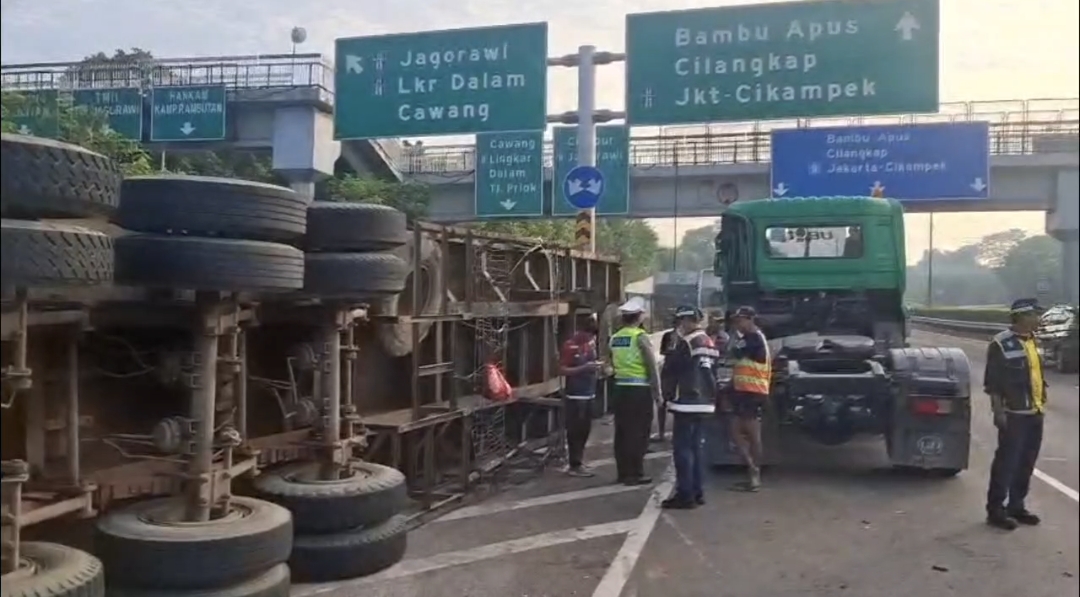“Telah terjadi kecelakaan kendaraan kontainer dari Meruya ke Cikunir. Kereta tempelannya patah sehingga terlepas dan terguling menabrak tembok pembatas tol. Akibatnya sudah terjadi perlambatan kendaraan,” ujar Kompol Dhanar saat dikonfirmasi di lokasi kejadian.