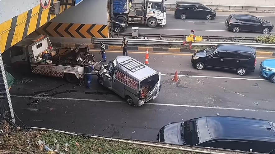 Infovalid.news (DKI Jakarta, Jakarta Timur) – Arus lalu lintas di dalam ruas tol TB Simatupang dari arah Kampung Rambutan menuju Ragunan, mengalami kelambatan usai tiga kendaraan minibus terlibat kecelakaan beruntun dengan satu kendaraan truk container.
